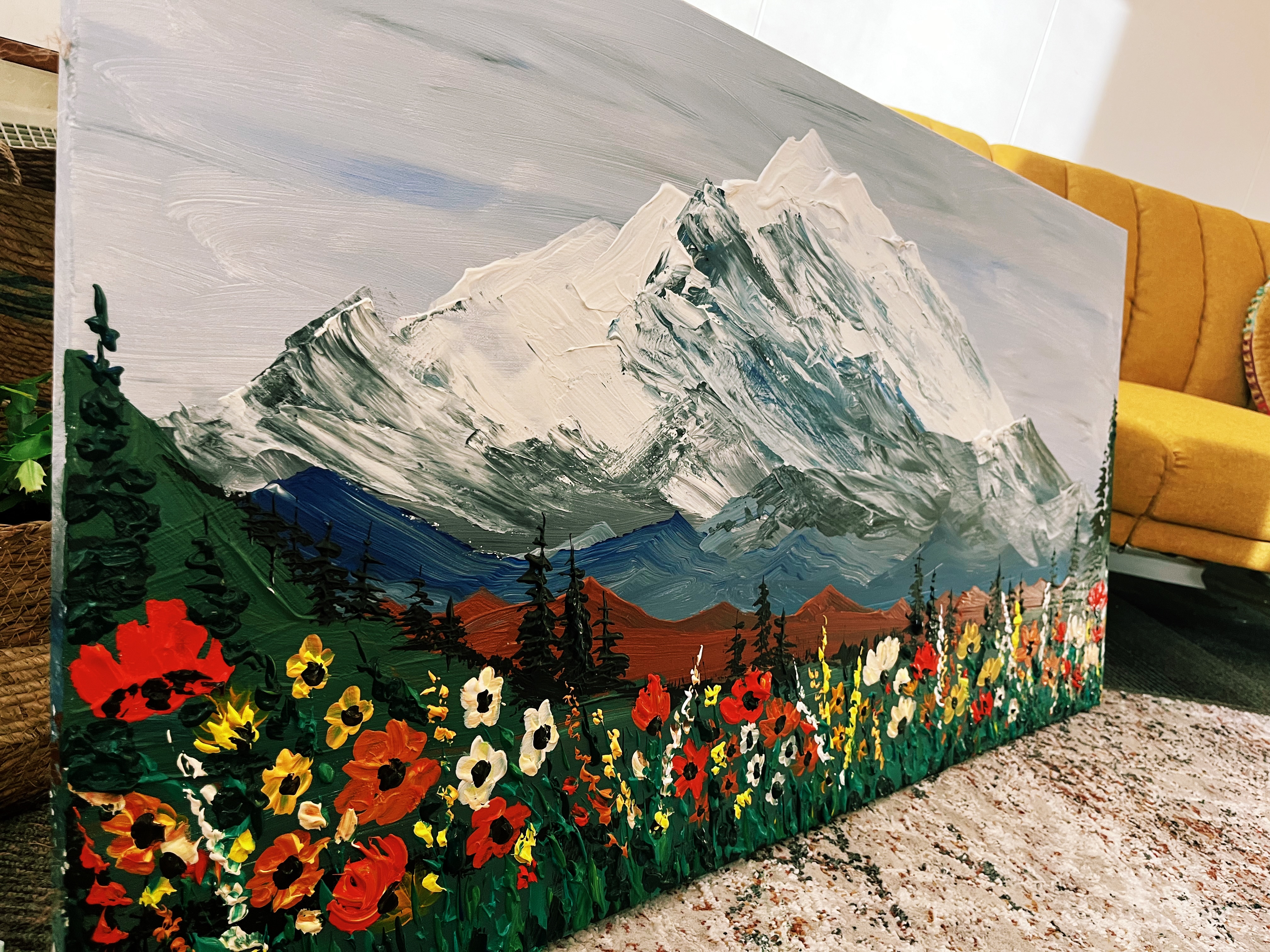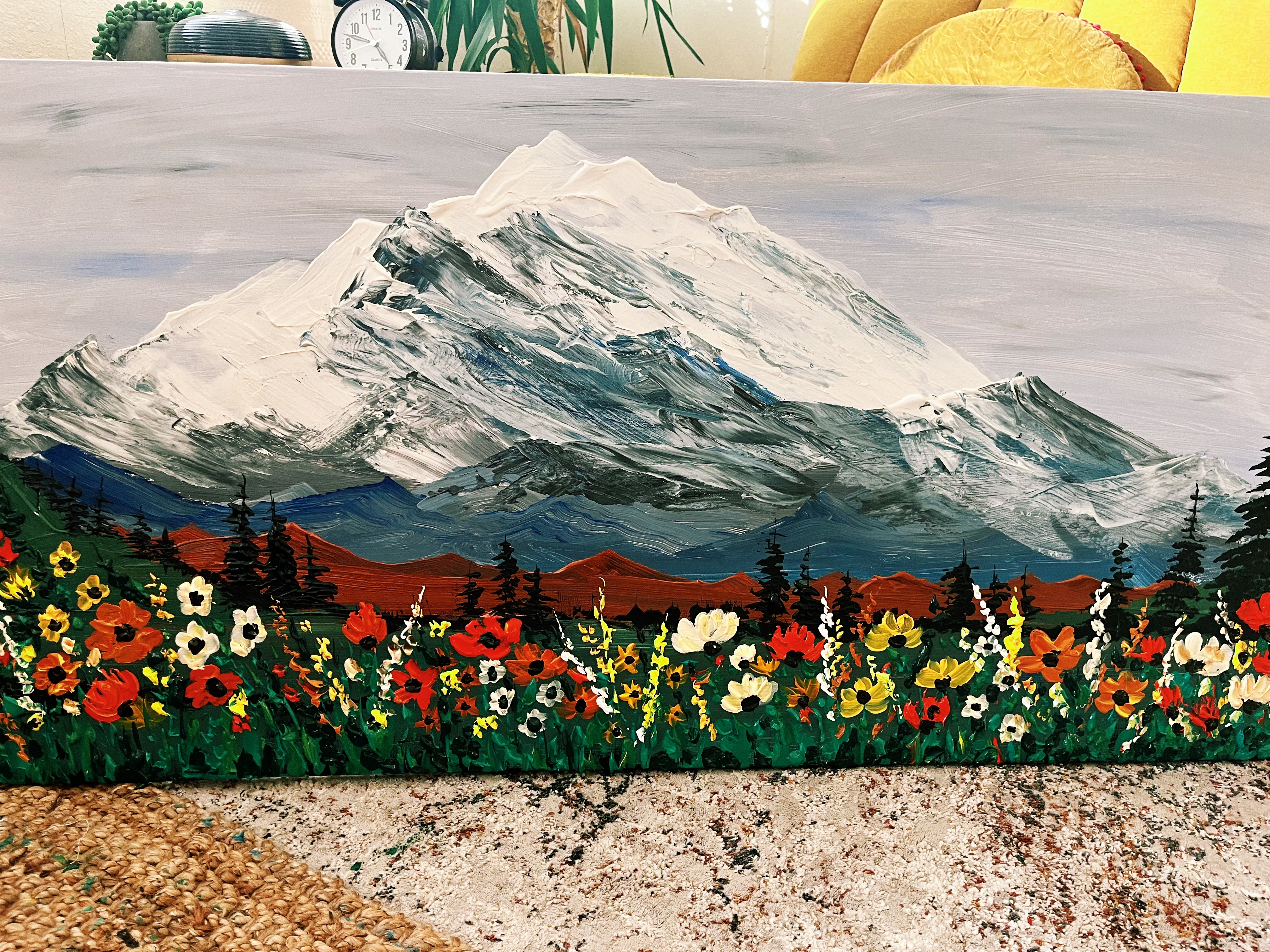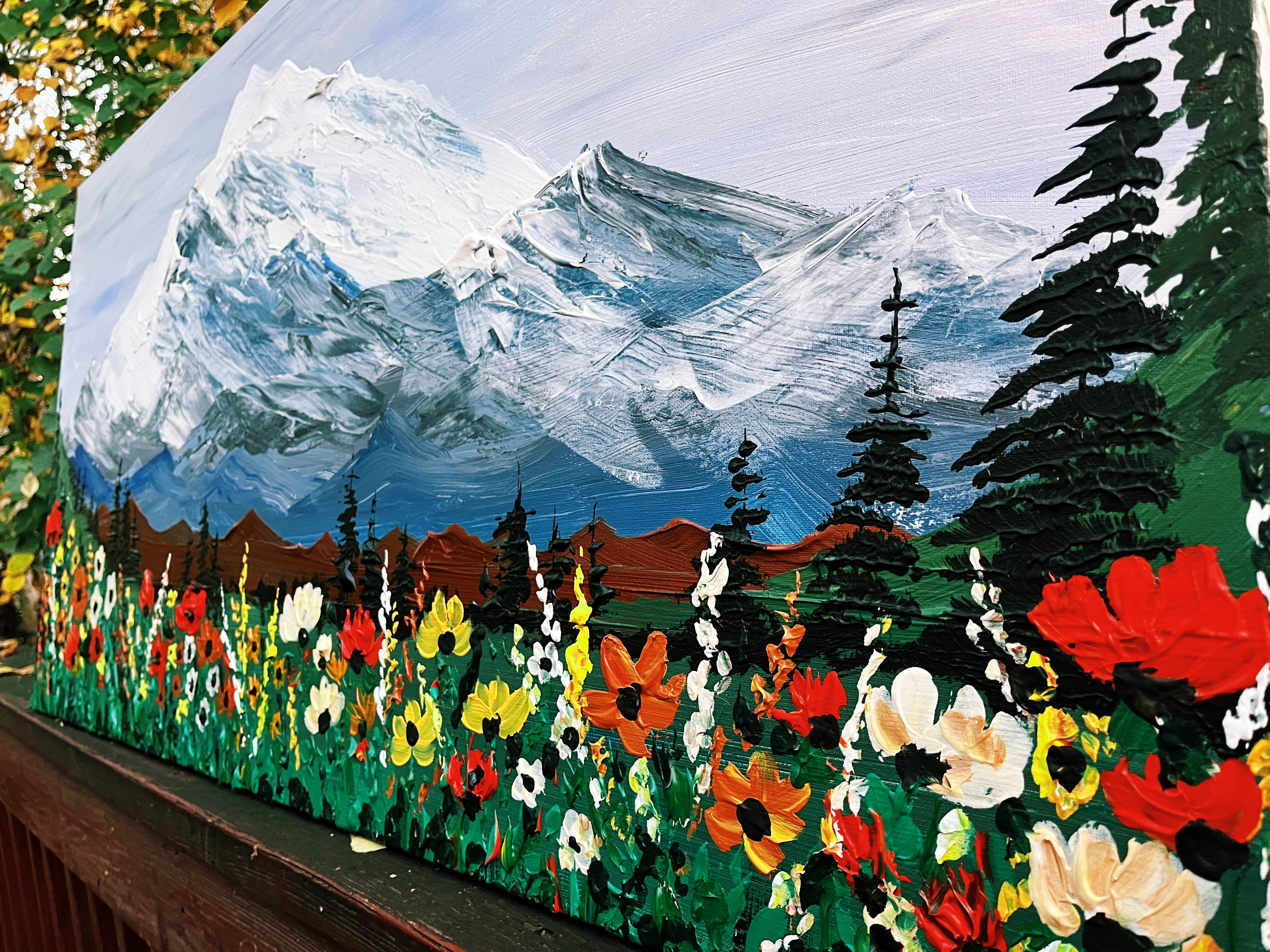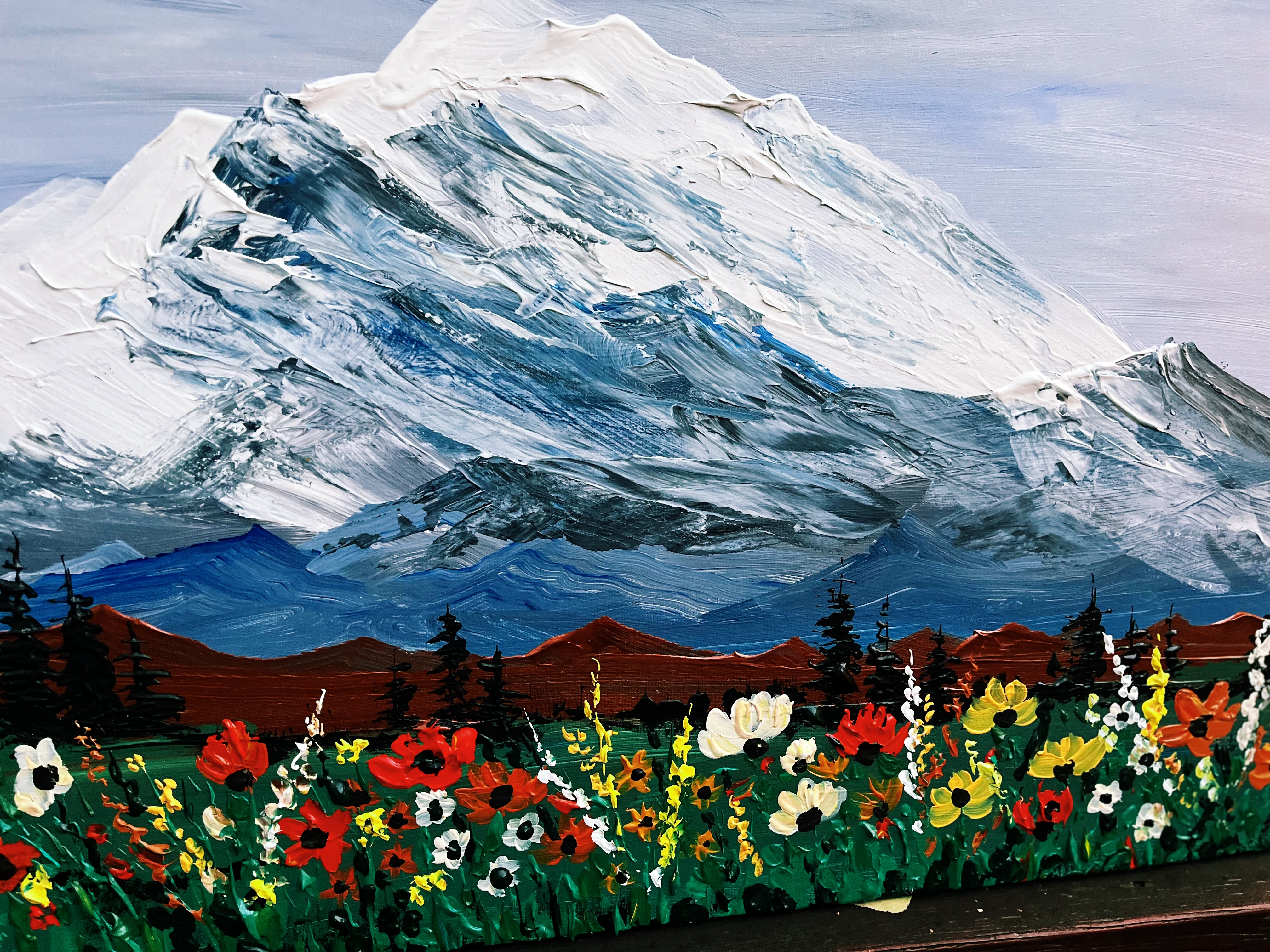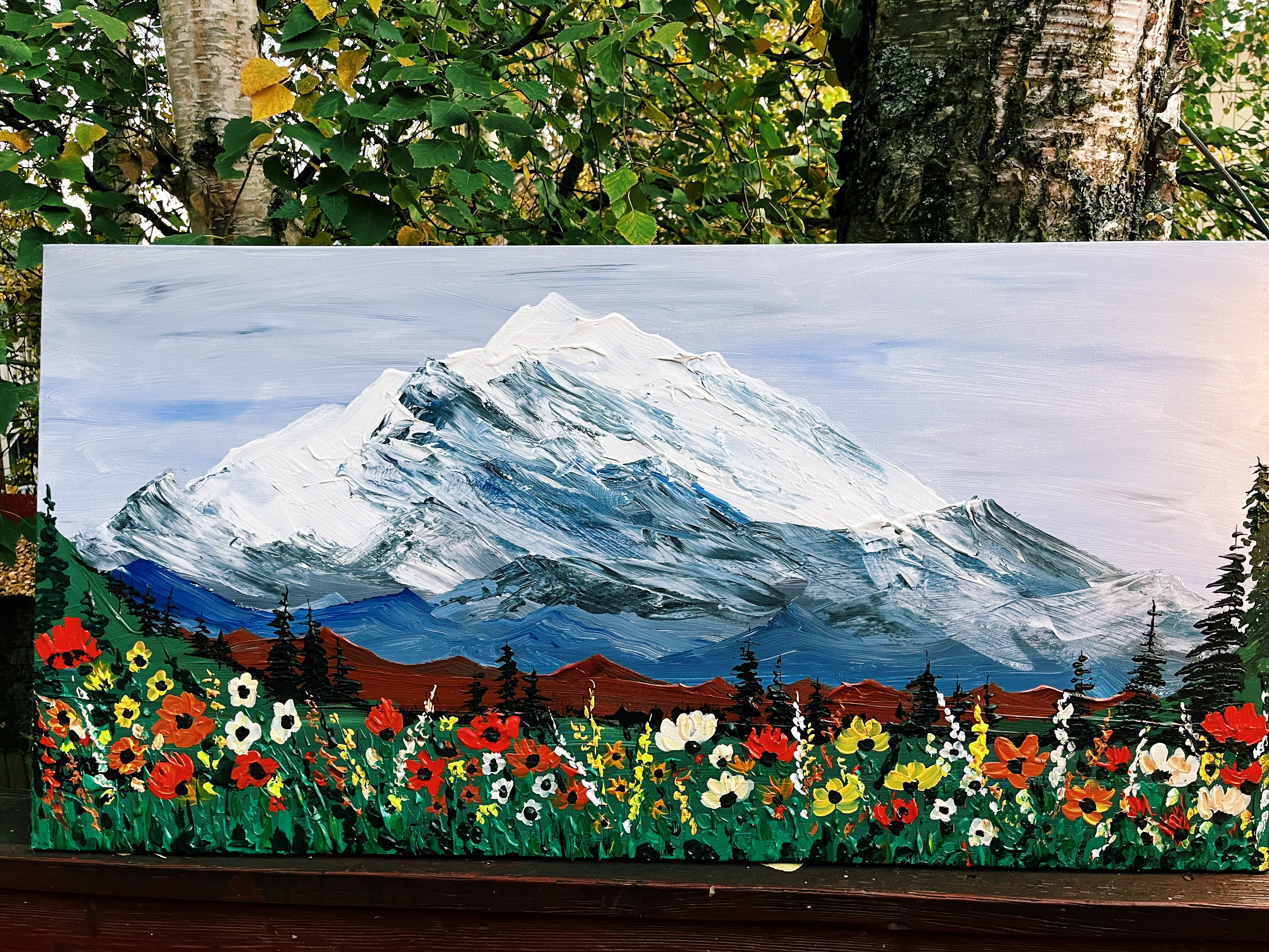 Autumn Flora at Denali is a new painting added to Christina’s collection in 2025. This painting is 2×4 feet with a 2 inch thick canvas border. This painting is a beautiful view of The Great One complete with beautiful Fall colors in the foreground. This painting will be beautiful in any space adding color and joy and light! Free shipping and delivery.