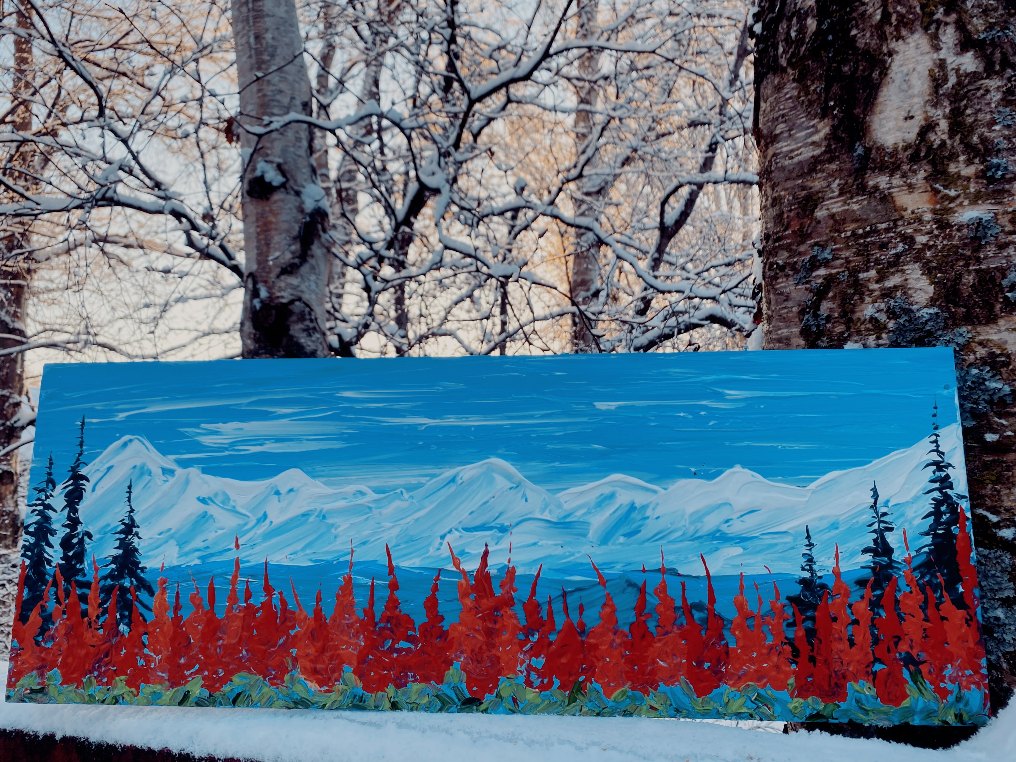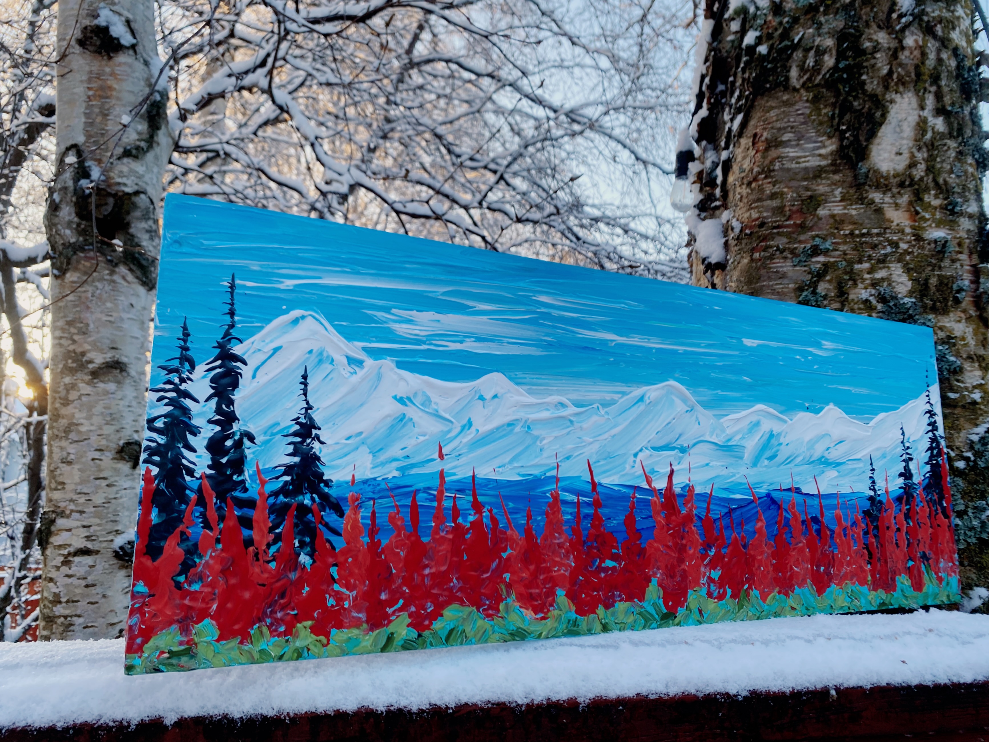 Chugach Fireweed Summer Views. This breathtaking panorama painting on wood at 1 feet by 3 feet is the quintessence of Alaska’s beauty with majestic evergreens, Chugach mountains, . It comes ready to hang with sawtooth mounting on the back. Free shipping. Enjoy a piece of our mountains and midnight sun for a lifetime.