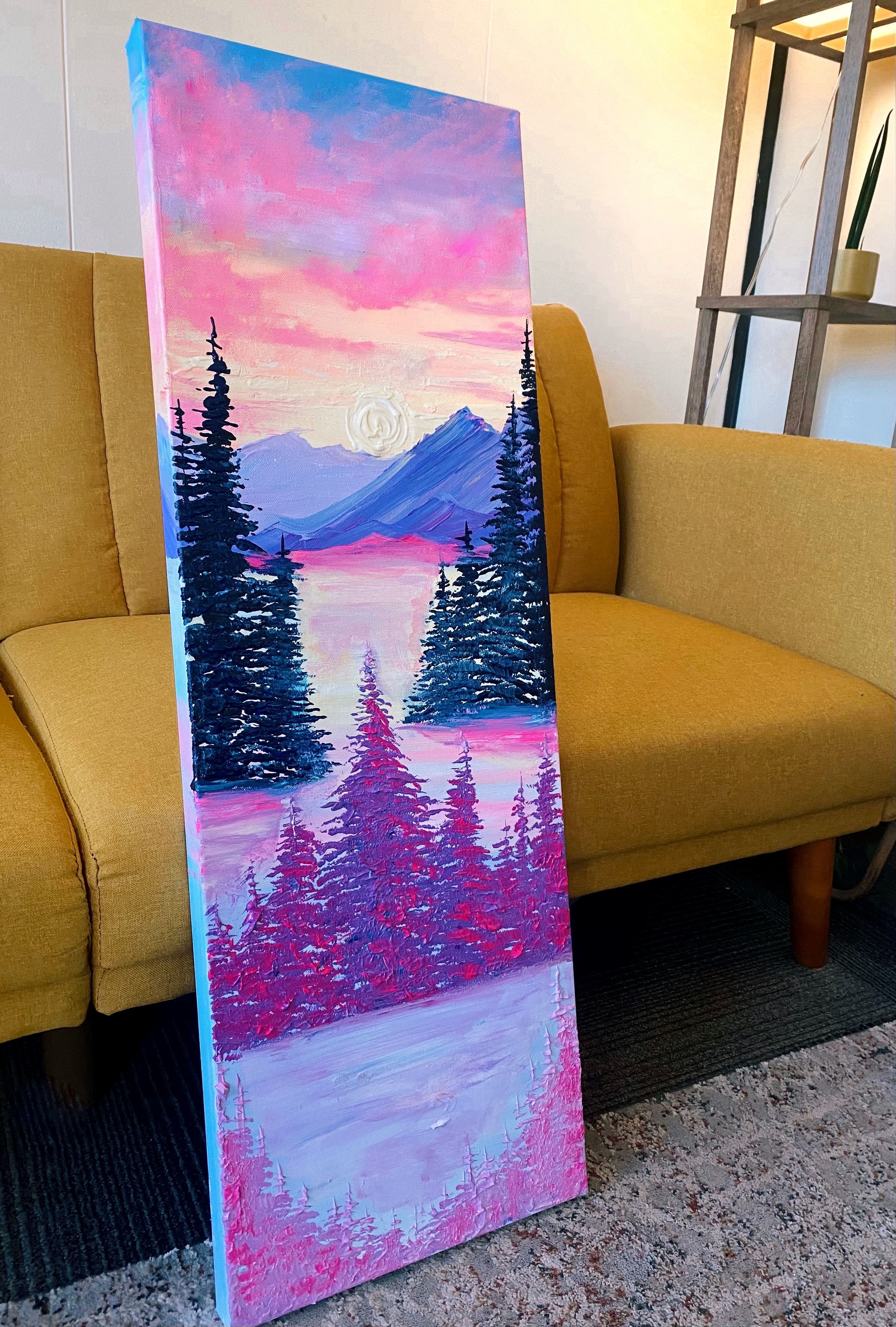 Views atop Old Woman’s Mountain, Kodiak. 12 Days of Christmas, Day 11. Where each day this season I release a brand new painting for purchase. This beautiful original canvas painting at 1×3 feet reminds me of beautiful views from the top of old Woman’s Mountain in Kodiak, in my opinion the most magical views atop any mountain in Alaska! It comes ready to hang with sawtooth mounting on the back. Free shipping.