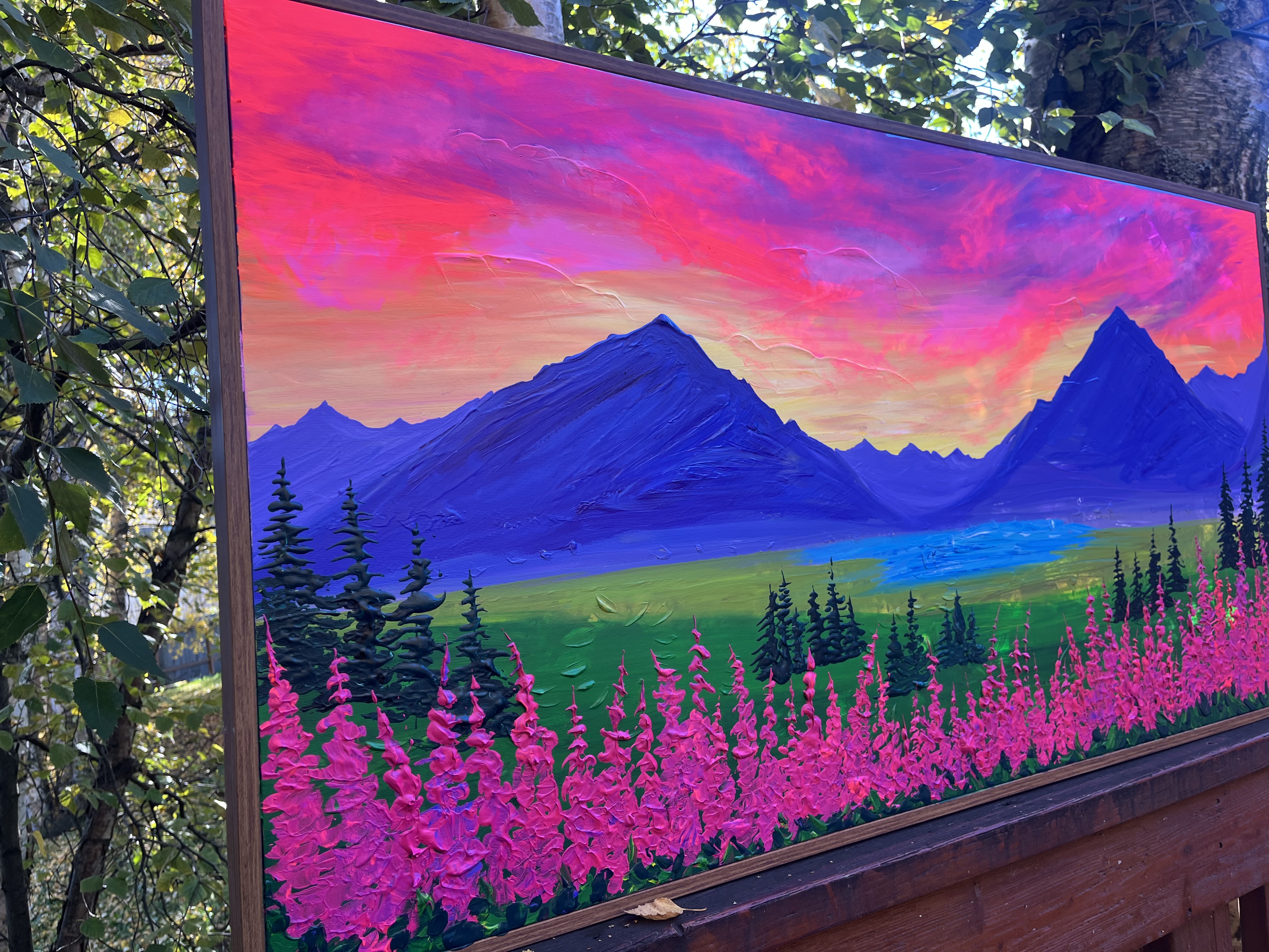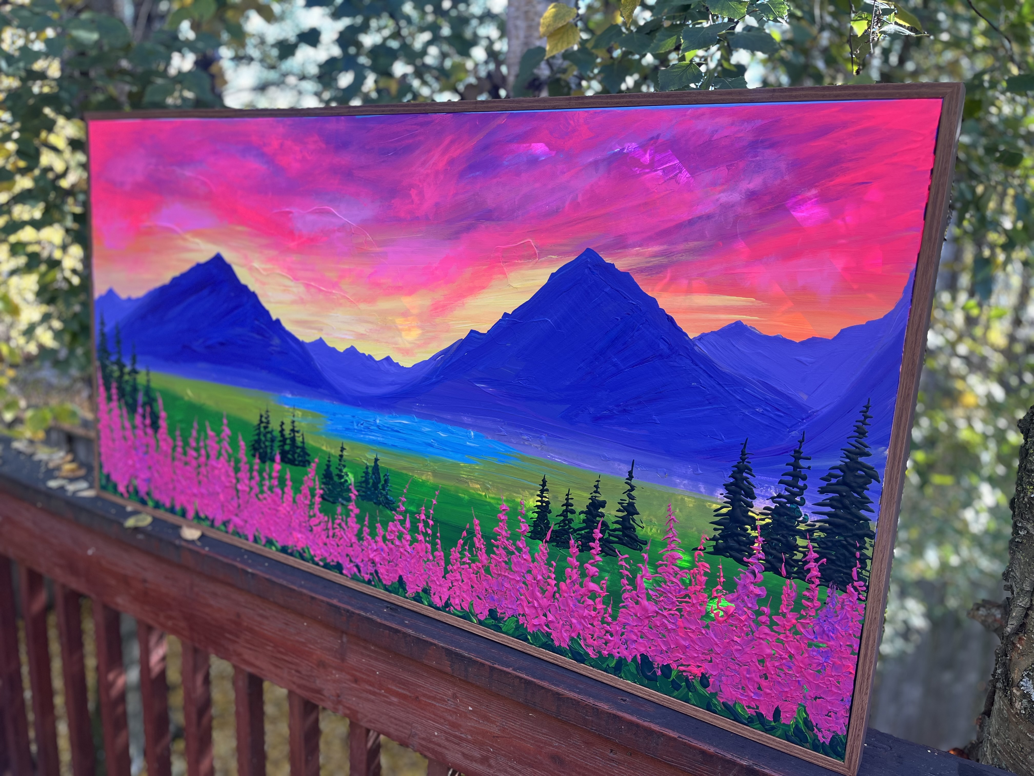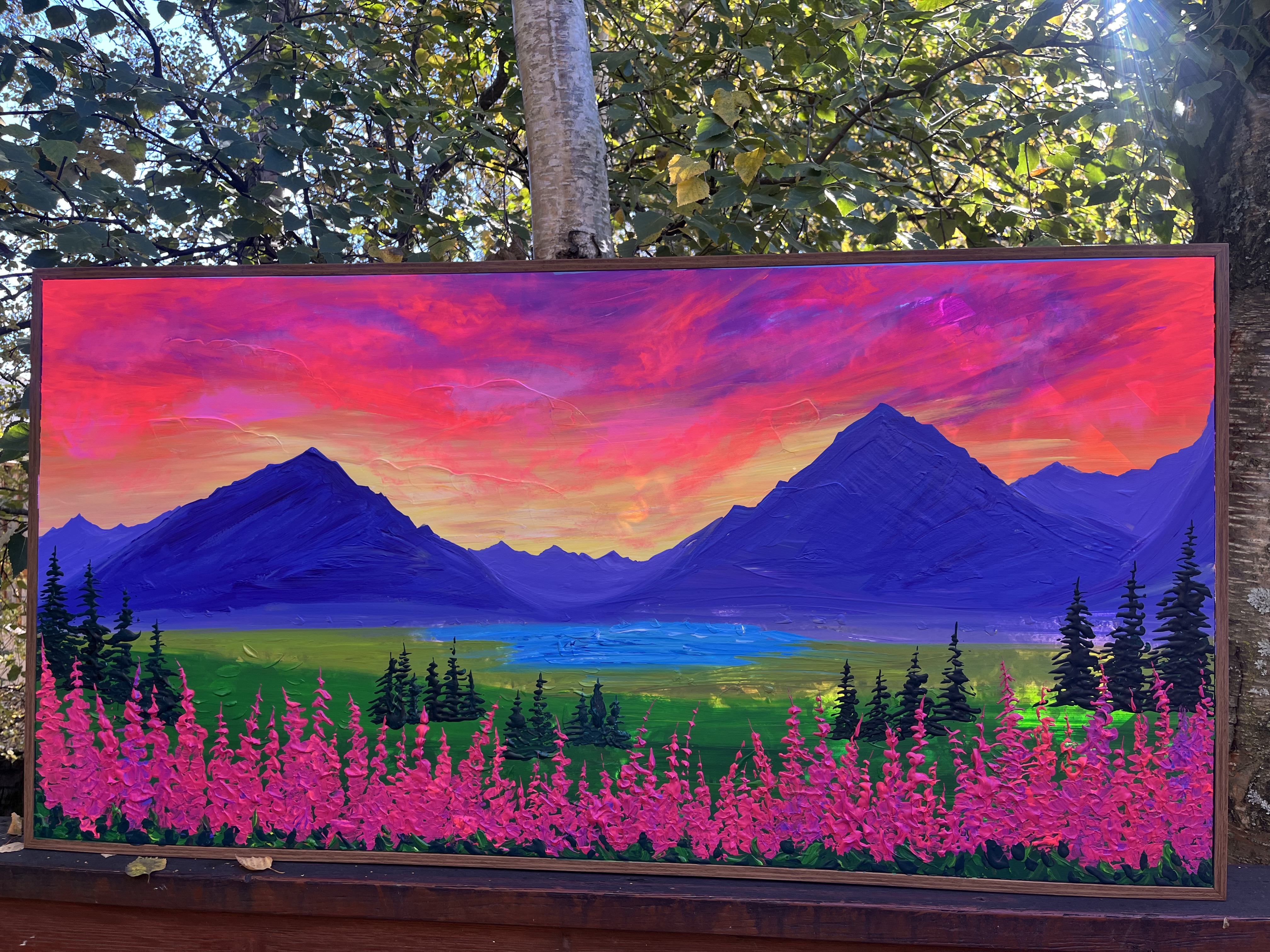 Views Near Williwaw Lake is a new painting added to Christina’s collection in 2025. This painting is 2×4 feet with a beautiful oakwood frame. This painting is a vibrant rendition of a summer scene hiking near Williwaw Lakes in the Chugach mountain range. This painting will be beautiful in any space adding color and joy and light! Free shipping and delivery.