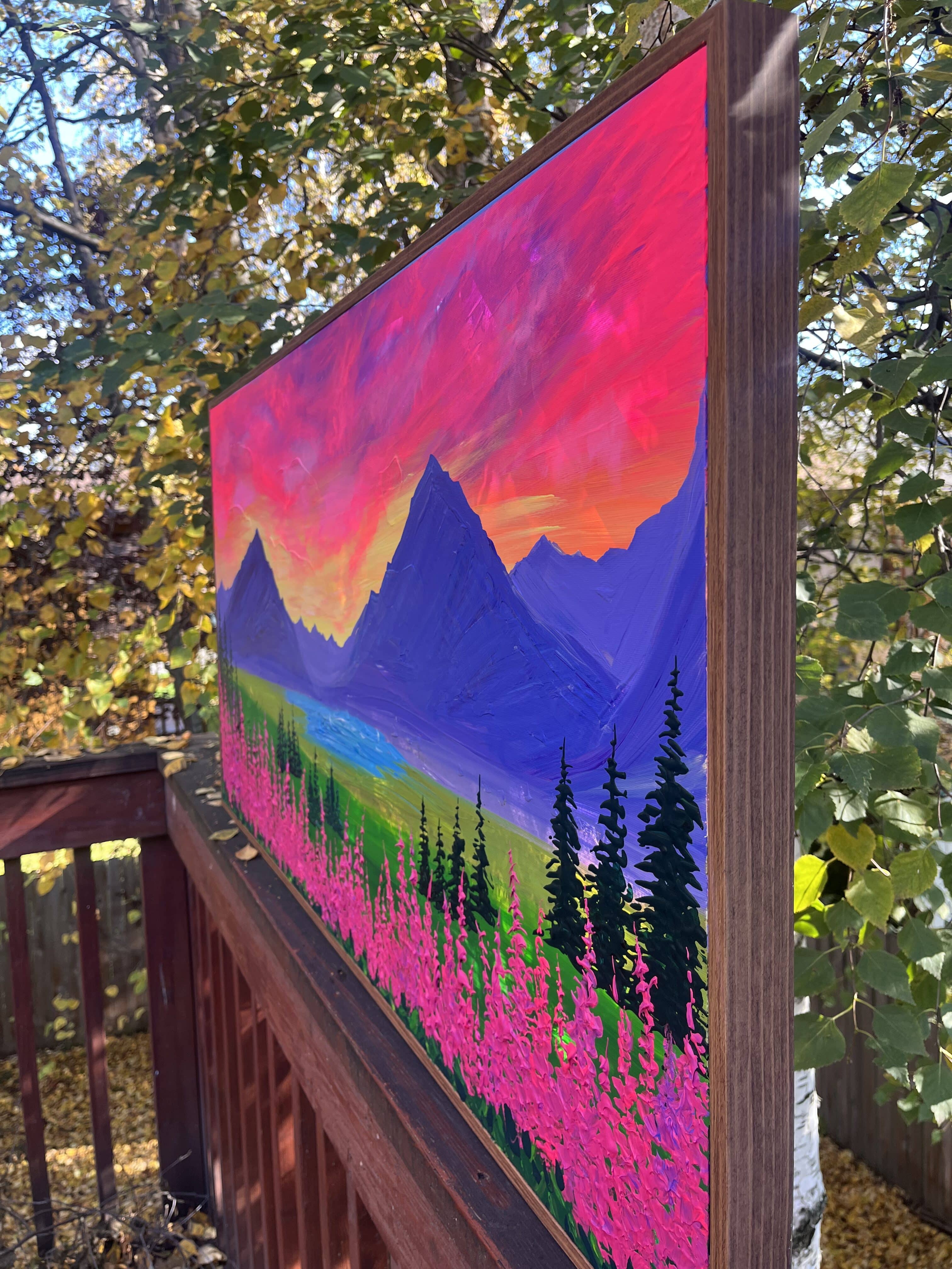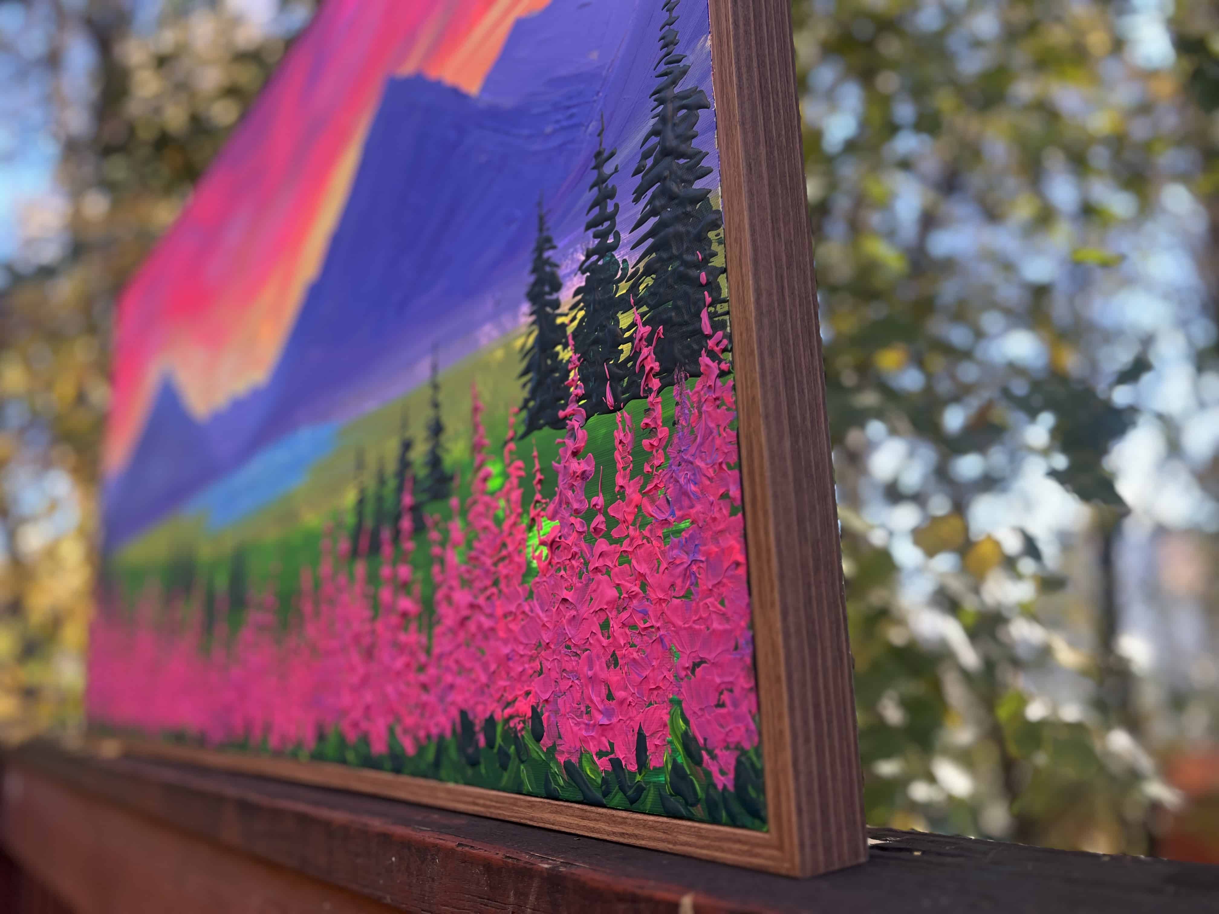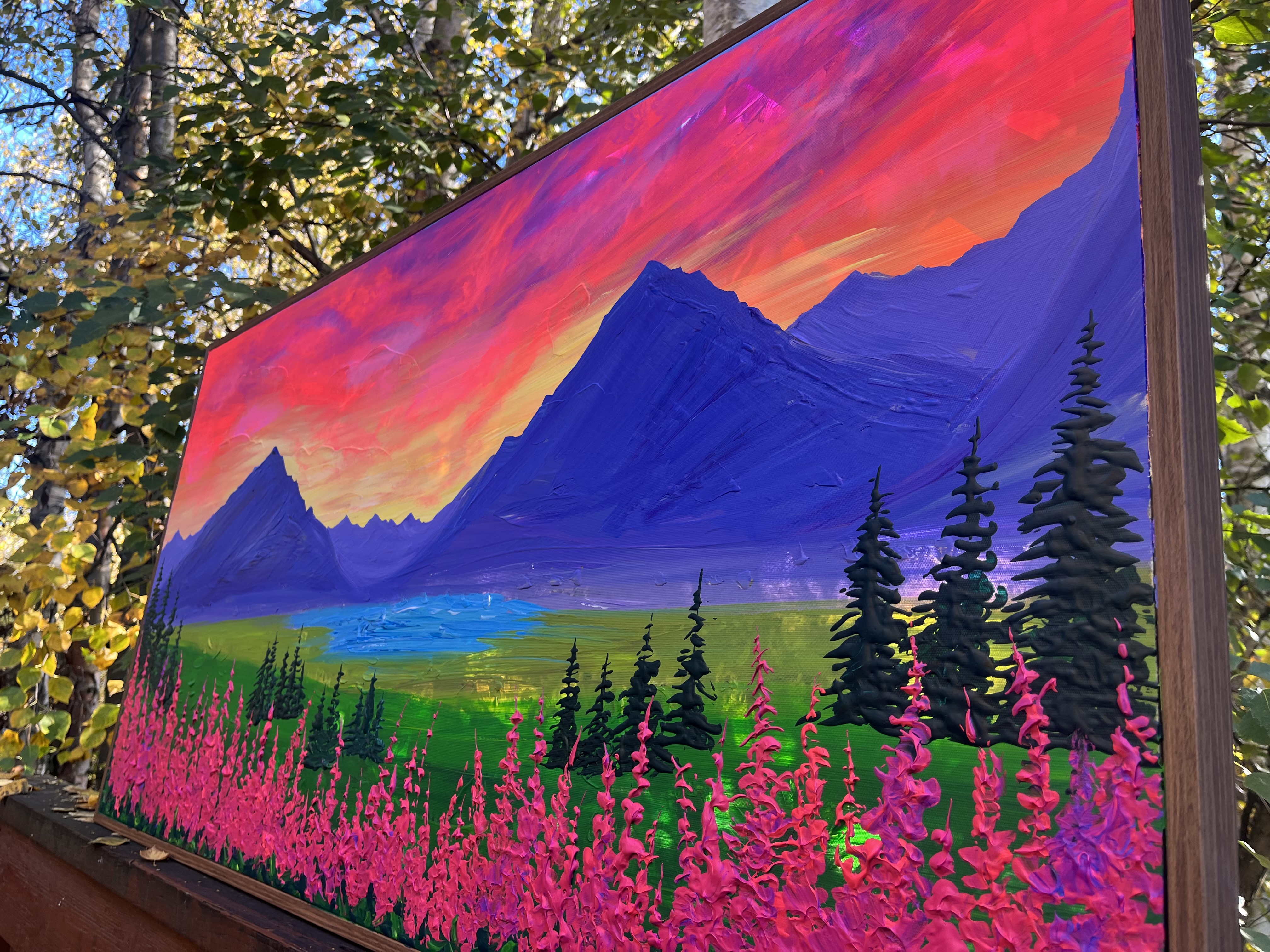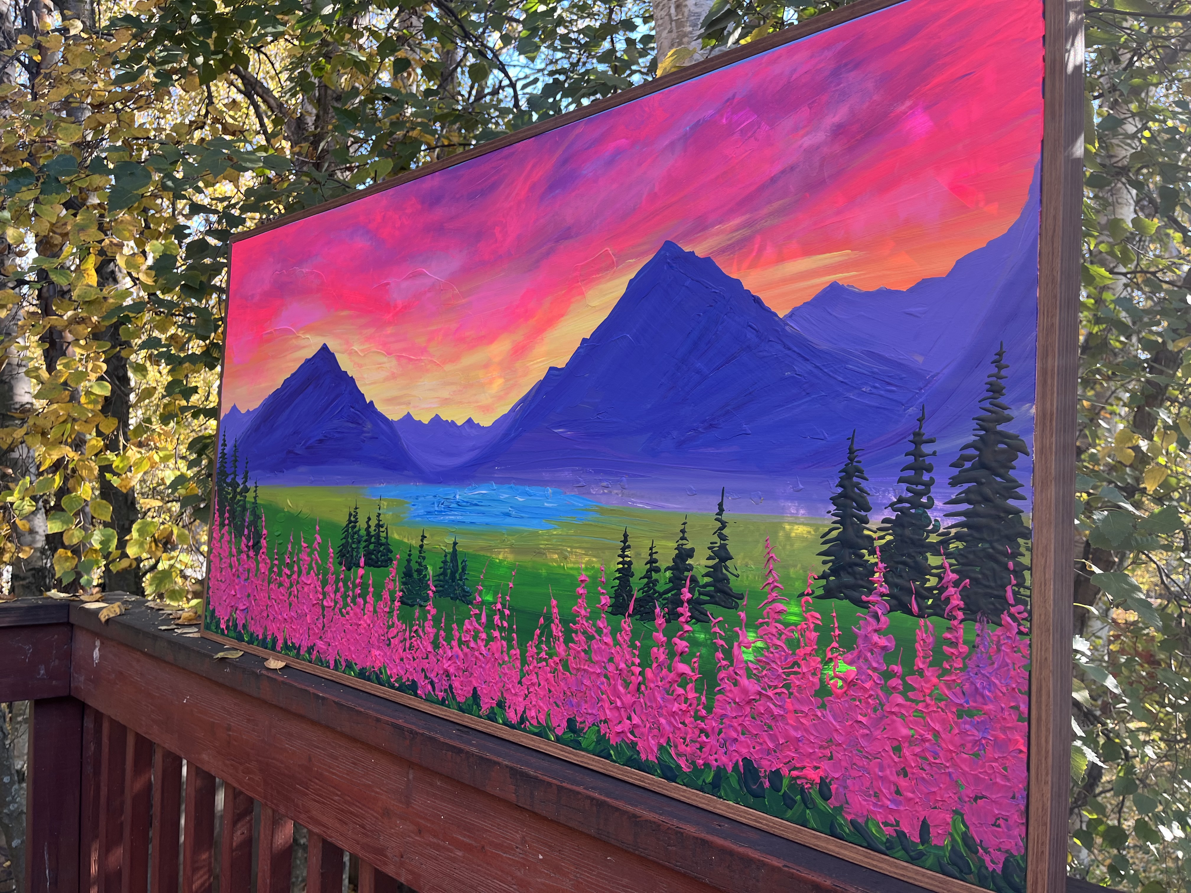Views Near Williwaw Lake is a new painting added to Christina’s collection in 2025. This painting is 2×4 feet with a beautiful oakwood frame. This painting is a vibrant rendition of a summer scene hiking near Williwaw Lakes in the Chugach mountain range. This painting will be beautiful in any space adding color and joy and light! Free shipping and delivery.